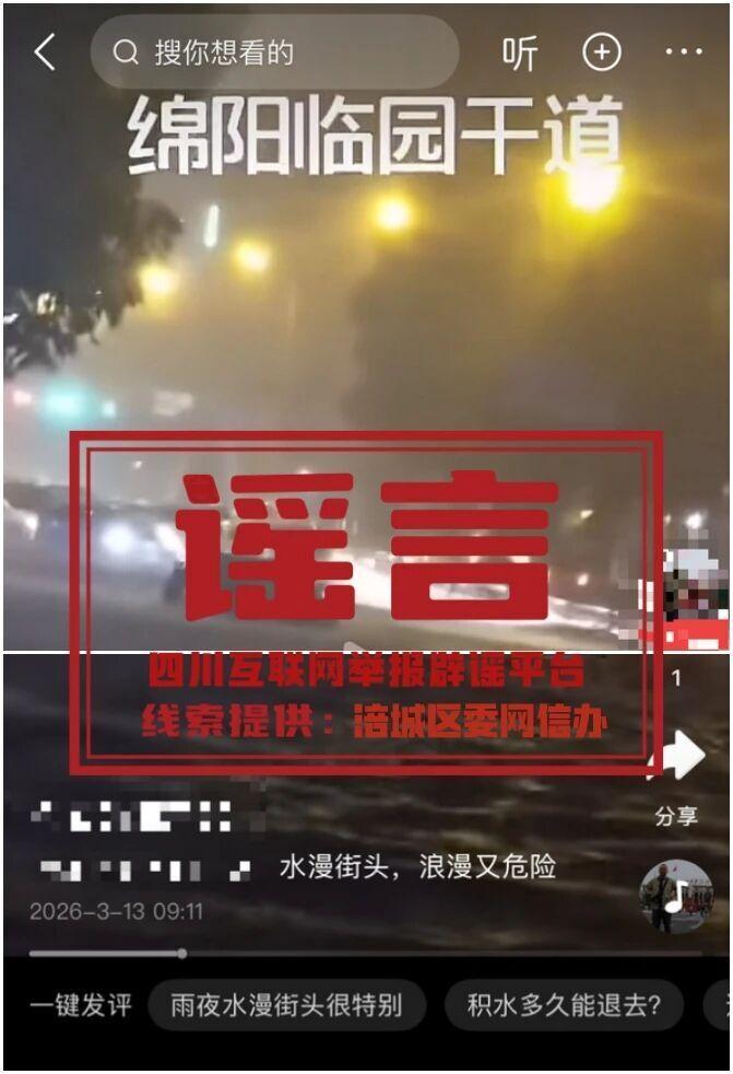 “雨夜綿陽臨園幹道水漫街頭”系謠言——熊貓斬謠(2026年3月16日)