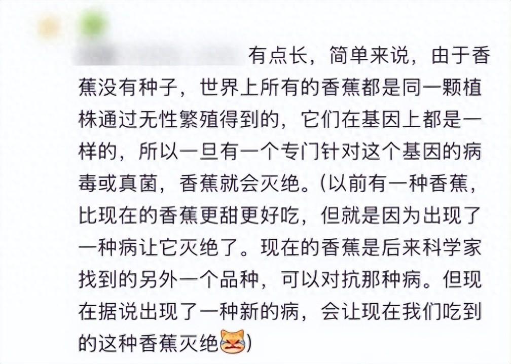 起因是有網友發帖稱:“由於香蕉沒有種子,世界上所有的香蕉都是同一植株的後代。據說以前的香蕉比現在更好喫,但爆發病害後就從地球上消失了。現在,新的香蕉病害又出現了,所有香蕉都會被感染,馬上就滅絕了!”