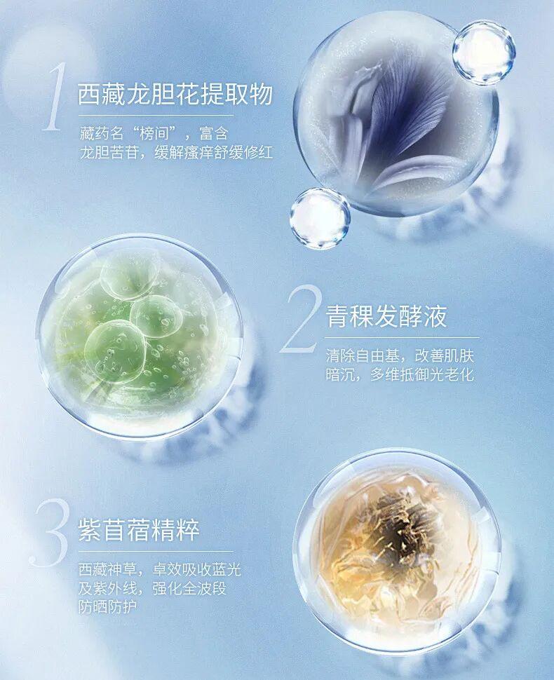 裏面添加了來自西藏海拔5100米的藏區當雄發現的珍稀“冰川低氘水”,直接替代了普通防曬裏的基底水。