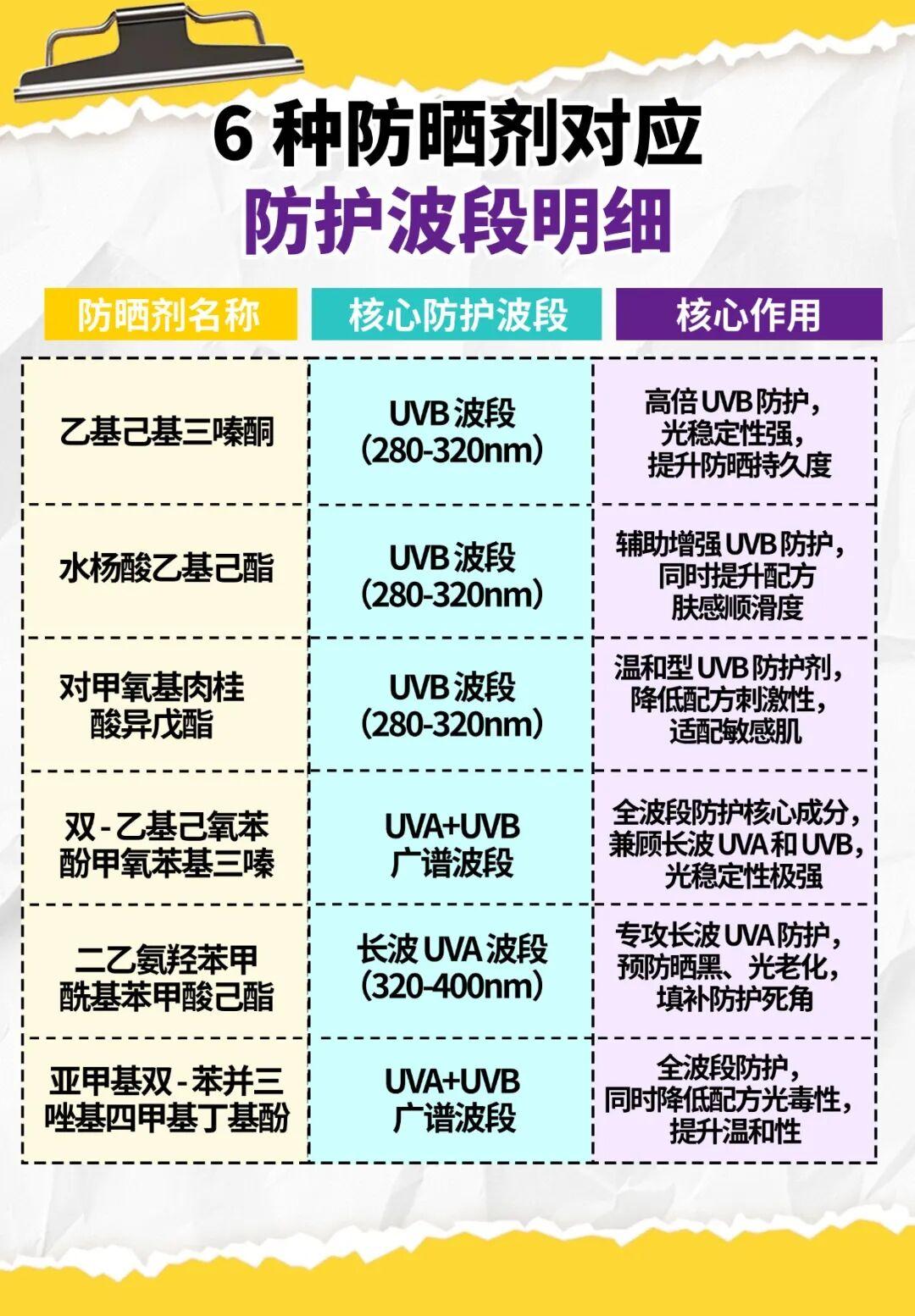 *6 種防曬劑均已納入《已使用化妝品原料目錄》,每種原料在國際 INCI 目錄、原料商官方技術資料(TDS)中,均有明確標註的紫外線吸收波長範圍,具備行業公認的權威屬性