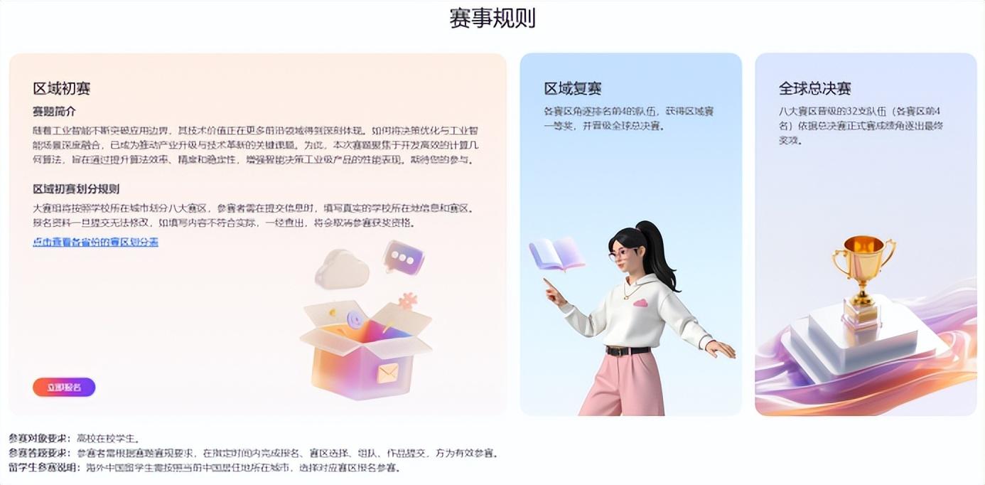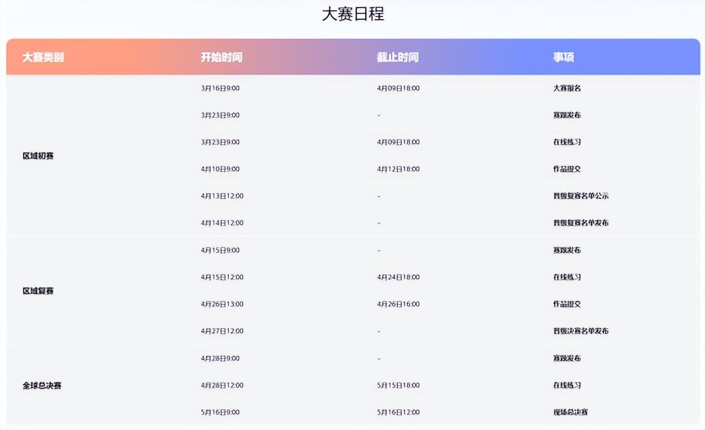 翻了翻官網上的日程,初賽題目3月23日公佈,4月9日報名截止,5月中旬全球總決賽見分曉。中間還有線上宣講會,華爲工程師親自拆解賽題背景——對想了解產業真實需求的學生來說,這本身就是一堂免費的“職場預科”。