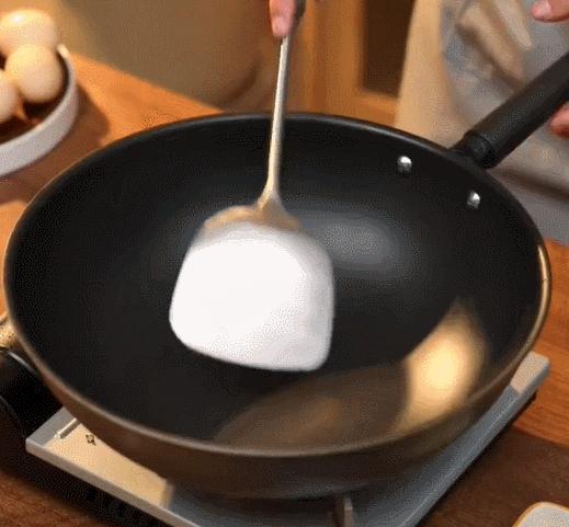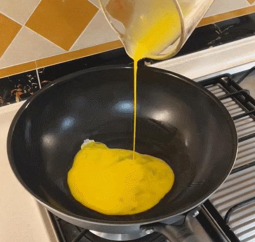 剛剛開火不久,雞蛋打下去馬上就凝固起來,到成品出鍋也絲毫不粘鍋。