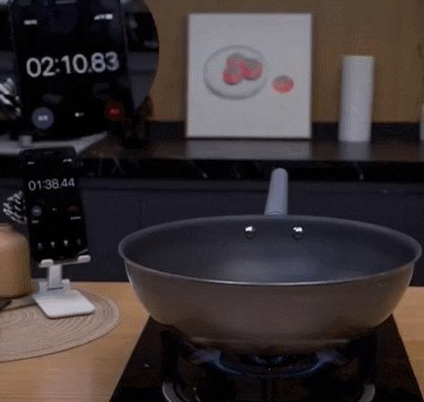 這就得講到它的獨特設計,品牌歷時7年,5萬次炒菜實驗研發,在炒鍋表面做了微納孔洞,烹飪時在鍋體和食物之間會形成微沸騰油膜,所以不粘不生鏽。