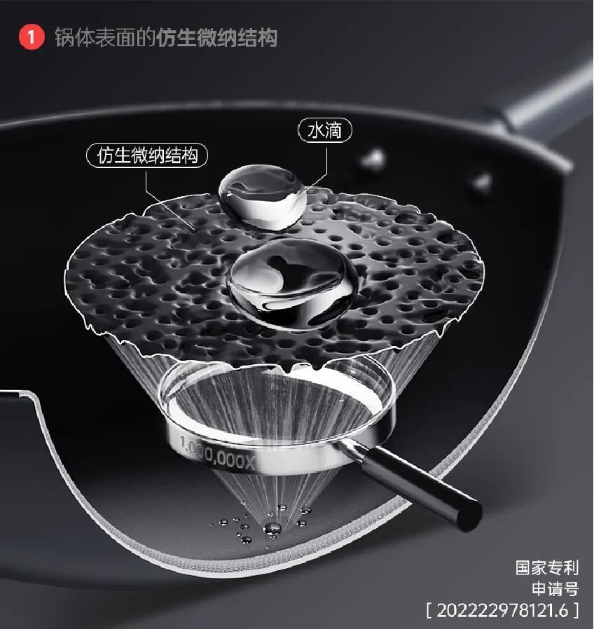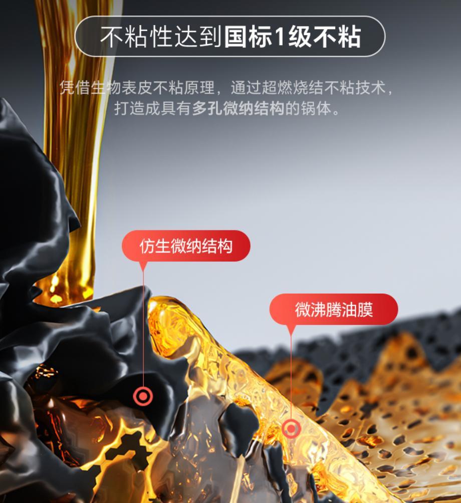 鍋體內部同樣採用新型仿生微納結構,能迅速吸油形成油膜,不用開鍋和養鍋,就能實現不粘。