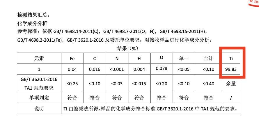 經檢測鈦含量達到99.83%,滿足GB/T 3620.1-2016中工業純鈦的要求,而且TAI也屬於高標準級別的純鈦。
