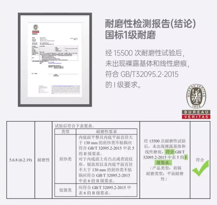 而且第三方機構檢測耐磨耐刮次數高達15500次,達到1級標準,超國標2級標準3倍!(國家GB3025.2-2020標準中,不粘鍋5000次耐磨即爲合格產品)