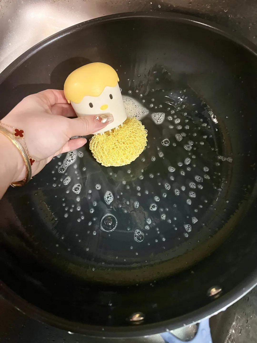 平時用完清水衝一下,百潔布一擦就乾淨了,完全用不上鋼絲球,巨省心。