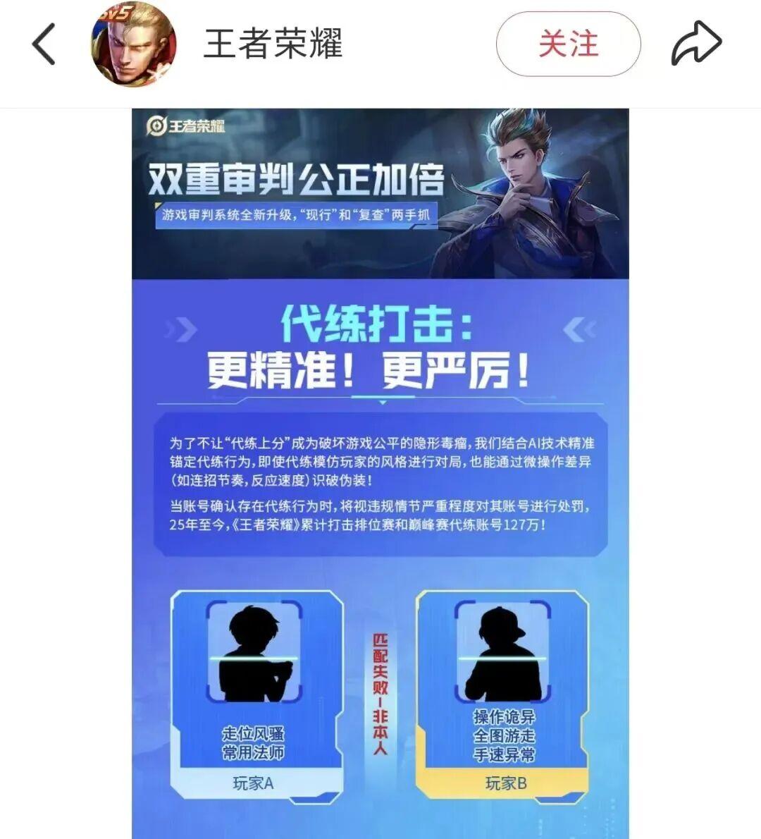 去年12月,廣西北海與浙江溫州蒼南縣網警,在騰訊遊戲安全團隊的協助下,成功偵破兩起使用外掛軟件陪玩護航、接單牟利的案件,共抓獲嫌疑人13名。這也是《三角洲行動》首例外掛陪玩工作室被搗毀的案件。今年3月6日,《王者榮耀》公告稱2025年以來累計打擊代練賬號127萬,並宣佈將結合AI技術精準錨定並打擊代練行爲。