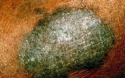 那塊硬殼,就像凍瘡很久之後留下的厚殼,不過手感更皮實粗糲,棕紅色也已變爲暗褐色。最開始的丘疹變厚之後,已經融成了一片,看上去就像“苔蘚”。