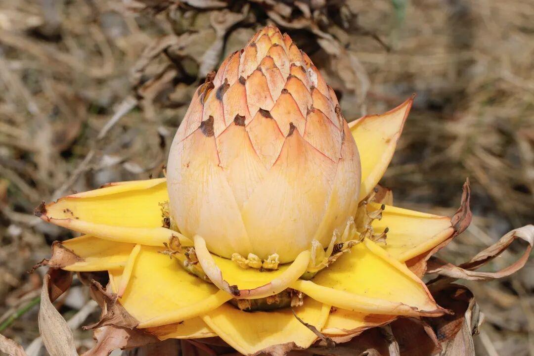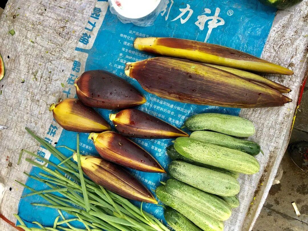 特別提一下芭蕉花,它是芭蕉屬多種植物的花序,一般選取的都是蕉串下方墜着的不育花,這個花序外面常有苞片包裹。芭蕉花在雲南的食用範圍比較廣,一般是切碎後醃漬15分鐘,洗淨就可以炒食或燉肉。地湧金蓮也是一樣的喫法。此外,芭蕉和地湧金蓮的假莖(心部的嫩葉)也常以“芭蕉心”出現在市場上,味道鮮美。