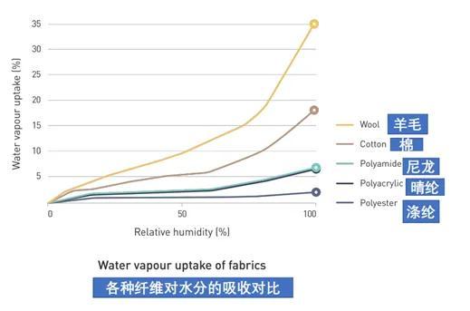 相對比其它常見材質,羊毛對水分的吸收能力有顯著優勢。
