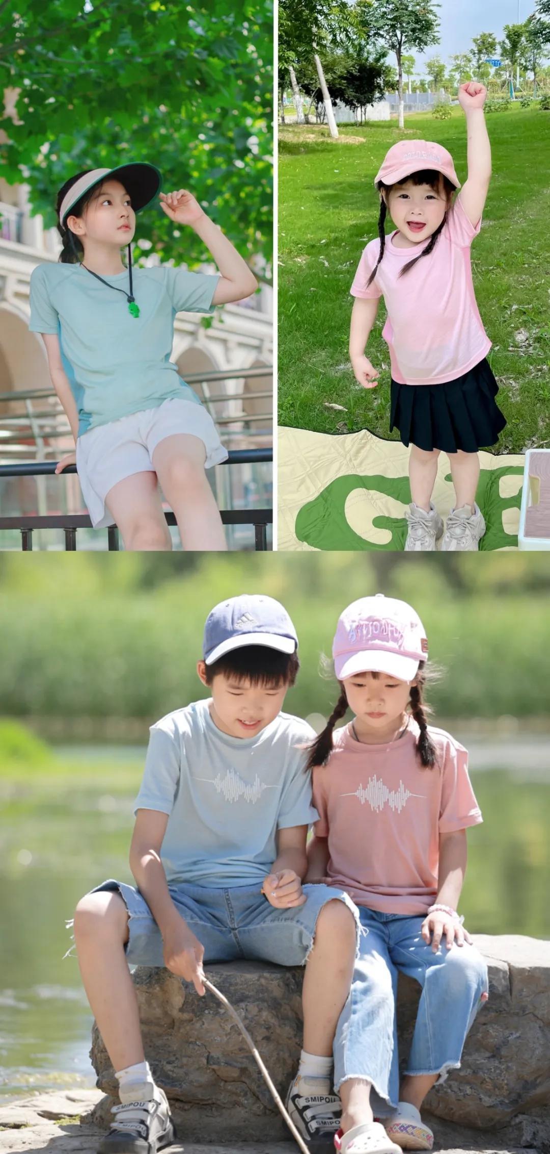 專場裏的兒童款有長袖衫、短袖T恤,還有內搭背心,有清新自然的簡約純色,還有充滿夏日活力的時尚拼色,以及趣味滿滿的山系圖案,今年新出了好多戶外圖案,特別童趣可愛!