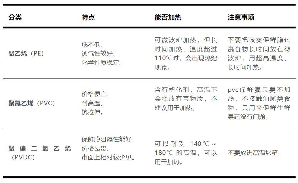 市面上常見的食品級保鮮膜材質主要有聚乙烯(PE)、聚氯乙烯(PVC)、聚偏二氯乙烯(PVDC)和其他生物降解材料。我們總結了材質特點和使用注意事項↓