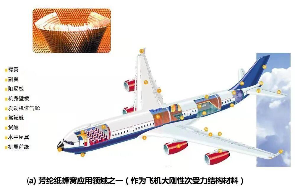 相比於傳統金屬材料、實心碳纖維板,間位芳綸紙製備的蜂窩芯材在夾層結構中展現出性價比與性能優勢,被廣泛應用於這些新型飛行器的機身壁板、地板以及電池艙外殼,在保障抗撞擊、抗剪切強度的前提下,實現了最大化減重,直接轉化爲飛行器的有效載荷與續航里程;而對位芳綸紙製備的蜂窩芯材,則僅用於少數對強度要求極高的核心承力部件。