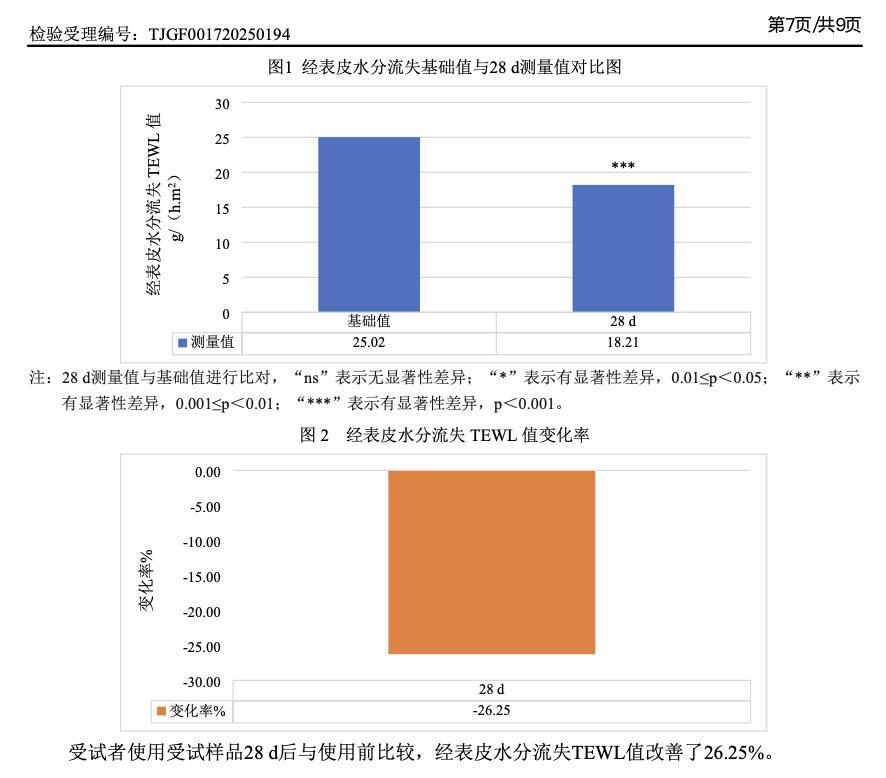 品牌方還做了33名受試者28天實測:經表皮水分流失TEWL值降低率爲 26.25%,保溼效果給力。