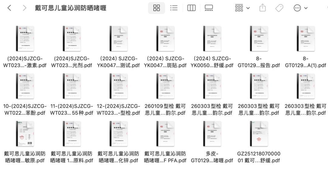 以新品防曬啫喱爲例,檢測報告鋪滿一整個文件夾
