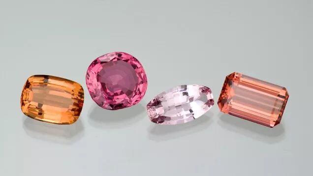 這組來自巴西黑金城還有俄羅斯烏拉爾山脈的寶石,展示了託帕石從金橙色到粉紅色的顏色變化。重量從7.61到14.33克拉不等 | GIA
