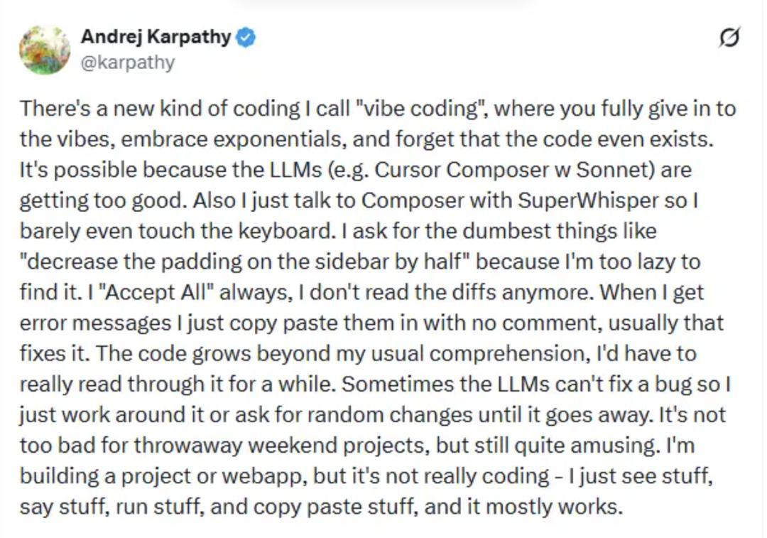 在差不多同一時間,AI 大神 Andrej Karpathy 在 X 上發了那條後來被無數人引用的推文,定義了一個新詞:vibe coding。