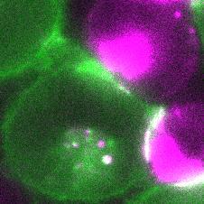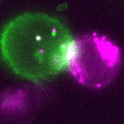粉色細胞正在通過胞啃將紅色熒光蛋白mCherry遞送給綠色細胞丨受訪者供圖