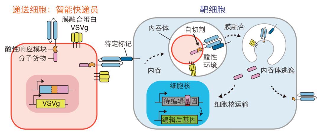沿着酸性環境這條線索,他們又找到了一段會在酸性條件下自動切割的氨基酸序列,並把它接到了想遞送的目標蛋白質上。這樣一來,當這些蛋白質隨着胞啃進入目標細胞內部、到達早期溶酶體後,就會在酸性環境中從膜上脫落,再借助VSVG逃離至目標細胞的細胞質乃至細胞核。陳心怡把這個過程形容爲“坐纜車”:遞送的蛋白質先借由胞啃進入目標細胞,然後在溶酶體裏下車,最終去往自己真正該去的地方。