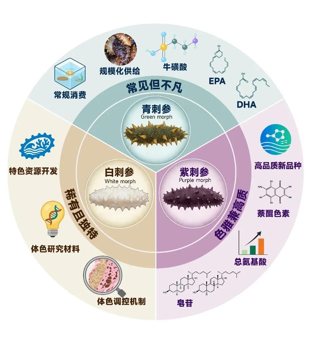 對刺蔘而言,體色具有重要研究和應用價值。刺蔘體壁既是主要呈色部位,也是主要可食部分,富含膠原蛋白、脂肪酸、多糖、皁苷等,是高值海珍品和功能性水產品開發的重要原料。體色不僅決定了刺蔘最直觀的外觀特徵,也與其體壁組織的物質組成、色素沉積以及生理代謝狀態密切相關。