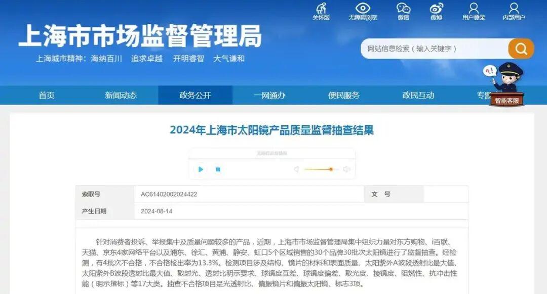 2024年上海市市場監管局發佈了一份太陽鏡質量監督抽查結果——30批次抽檢,4批次不合格,不合格率13.3%。