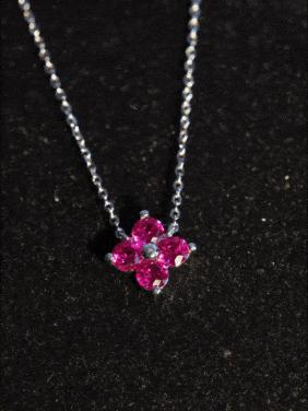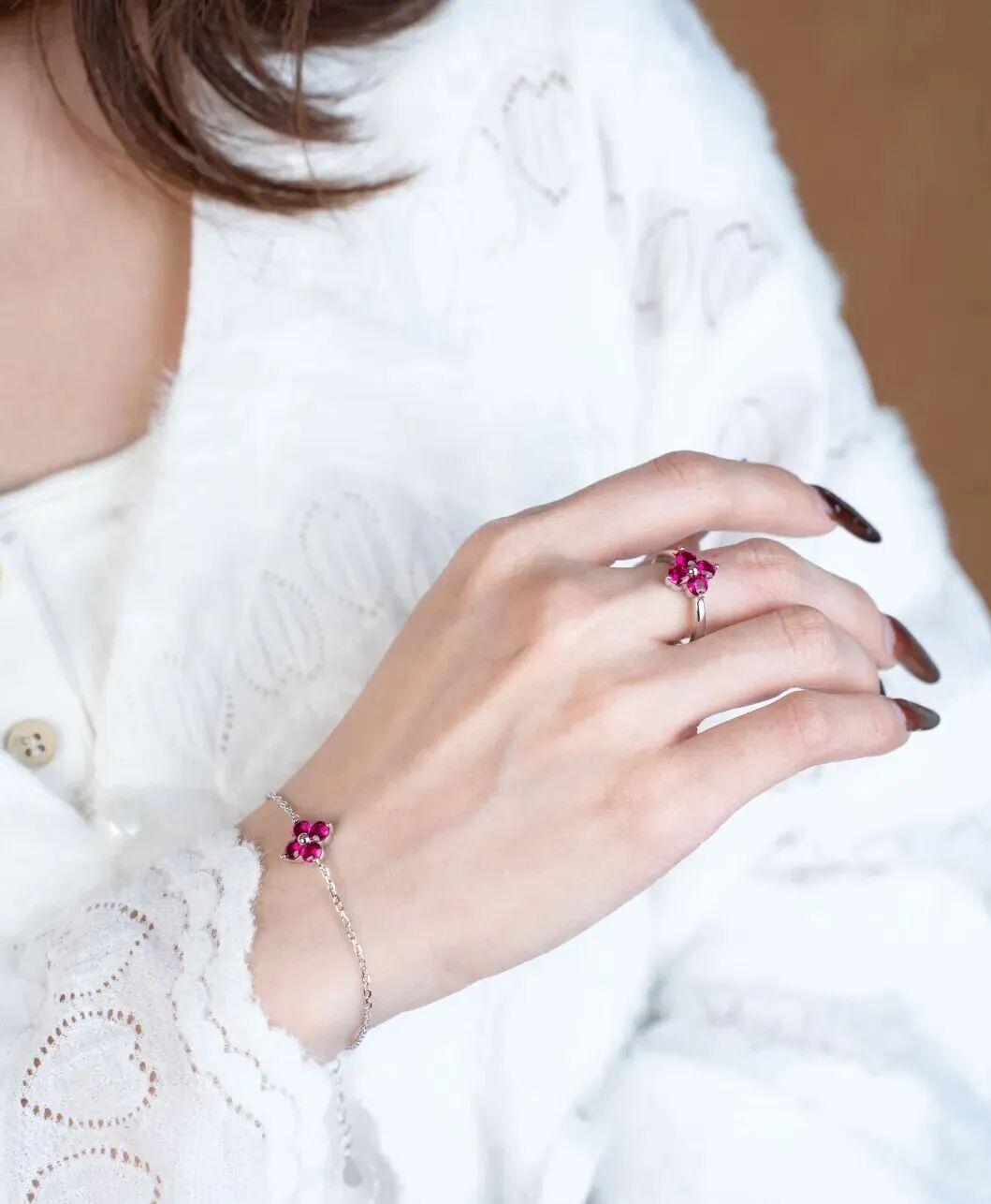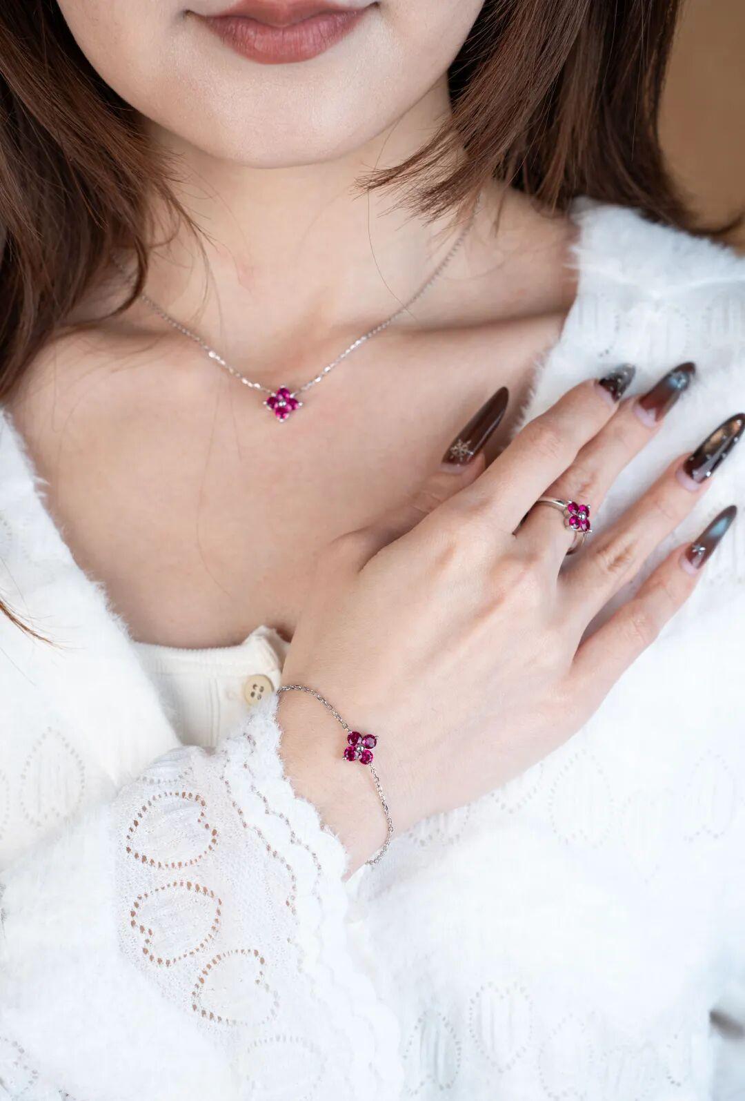 以象徵幸運的四葉草爲原型,四顆培育紅寶石如同花瓣一般,層疊舒展的瞬間定格在金屬與寶石之中。四瓣花型的設計,既保留了花朵的柔美形態,又融入了幾何線條的利落感。