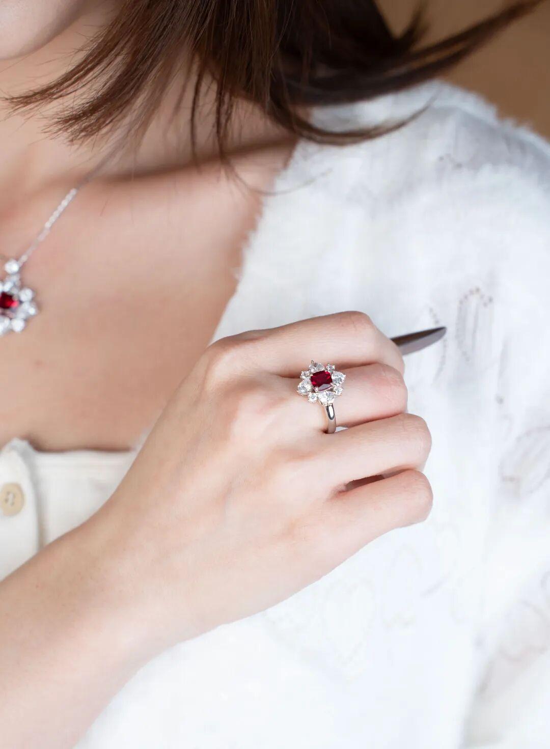 紅色的熱烈與白色的純淨形成強烈視覺衝擊,既保留了紅寶的華貴氣場,又通過四周的柔化讓整體造型更具層次感。