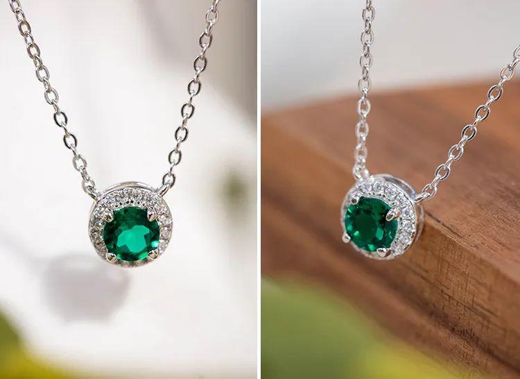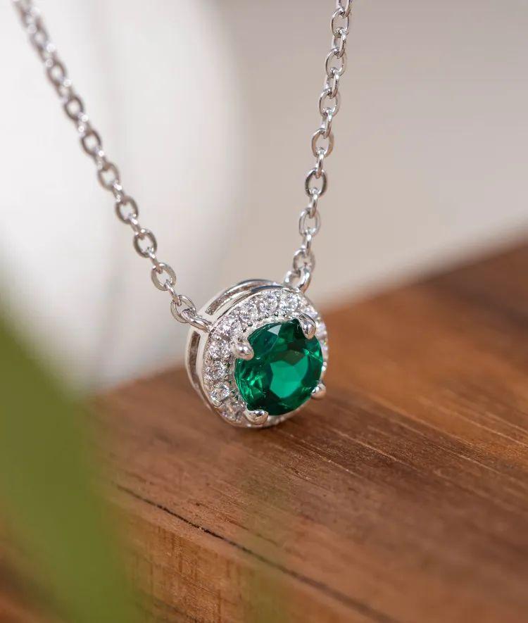 一顆精緻的圓形培育祖母綠,它散發着深邃的色彩和寶石的光澤,爲整個項鍊增添了一抹自然的生機。