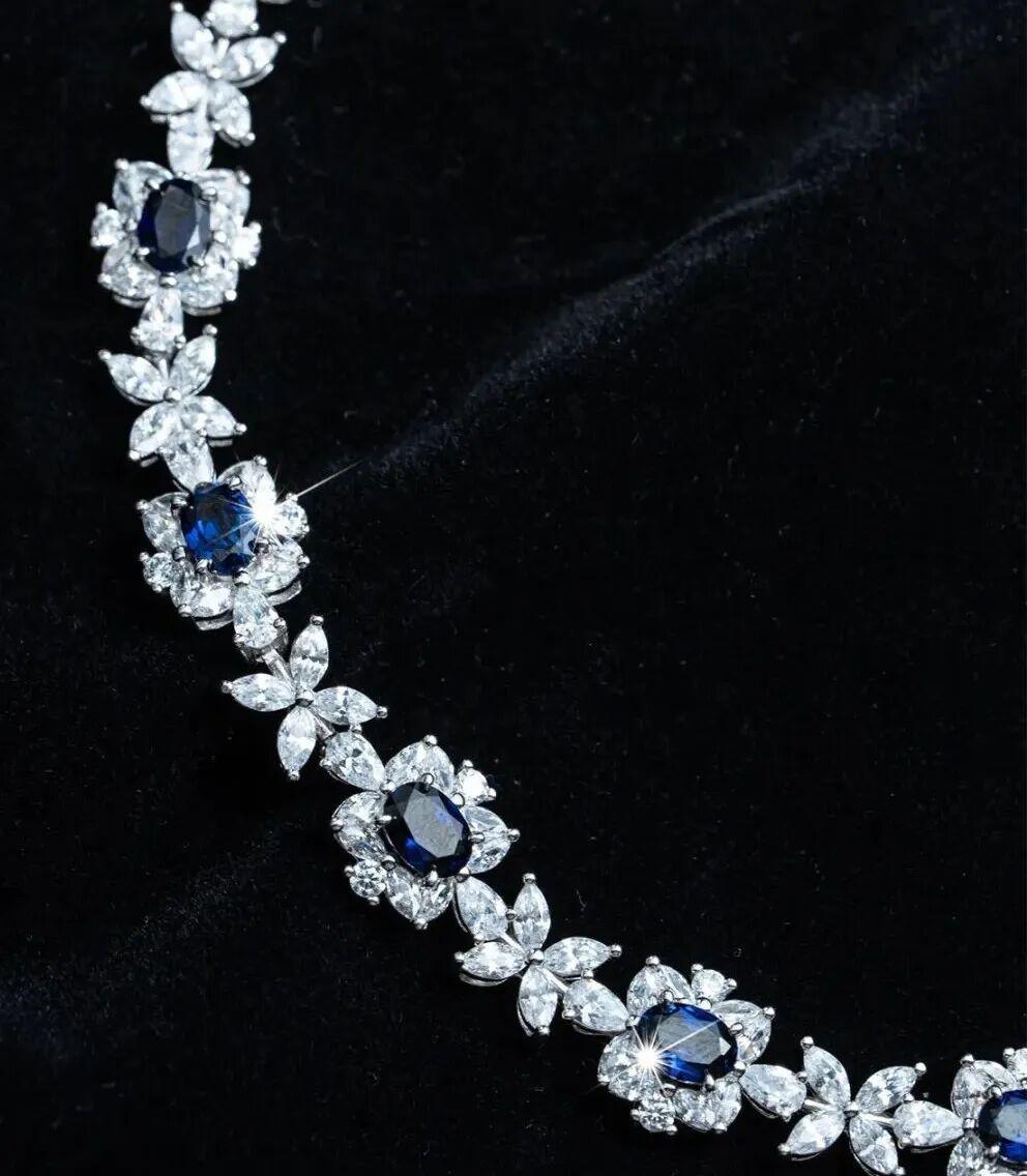 大量的鋯石組成繁複花環造型,與深邃的藍寶石交相輝映,如牡丹一樣盛放,雍容貴氣,這個套裝有項鍊、戒指可選。