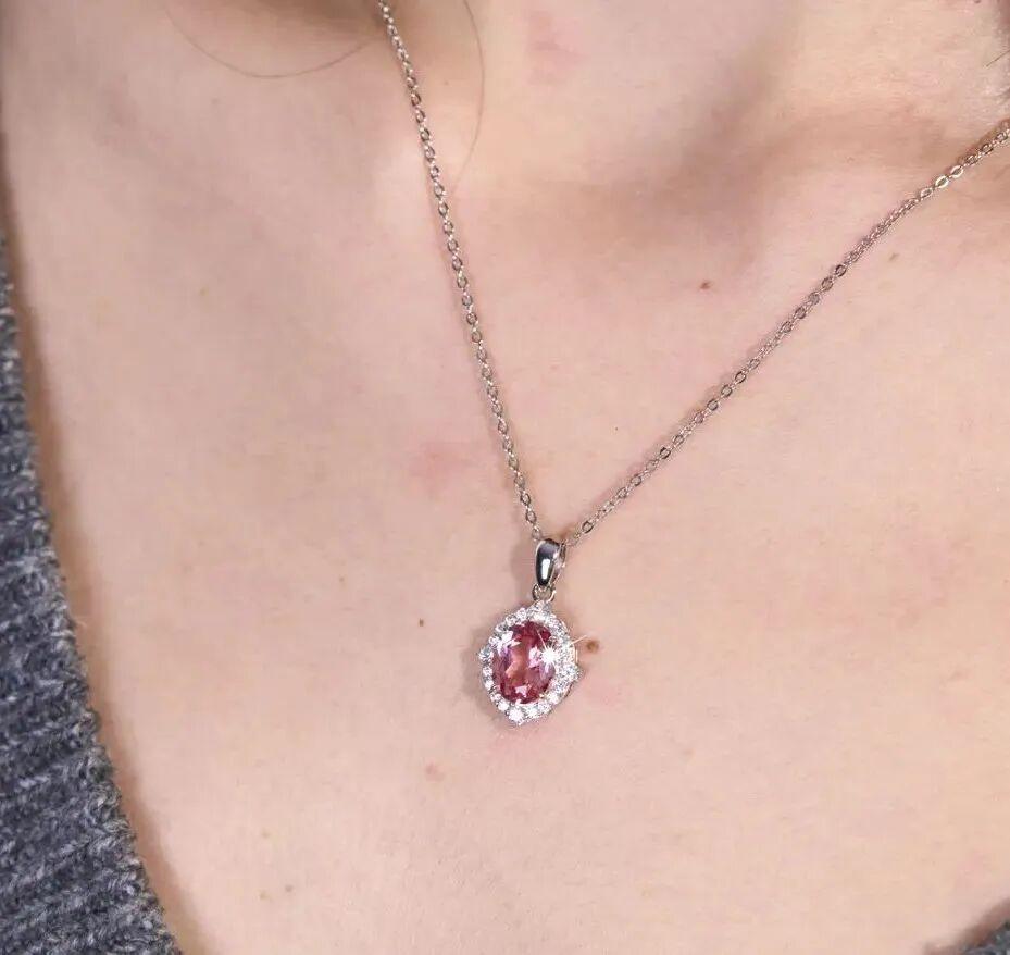 項鍊是2.6克拉的蛋形培育寶石,精切工光下閃耀着如蓮池清澈的漣漪閃耀感,一層一層柔光,美如夢幻一般。