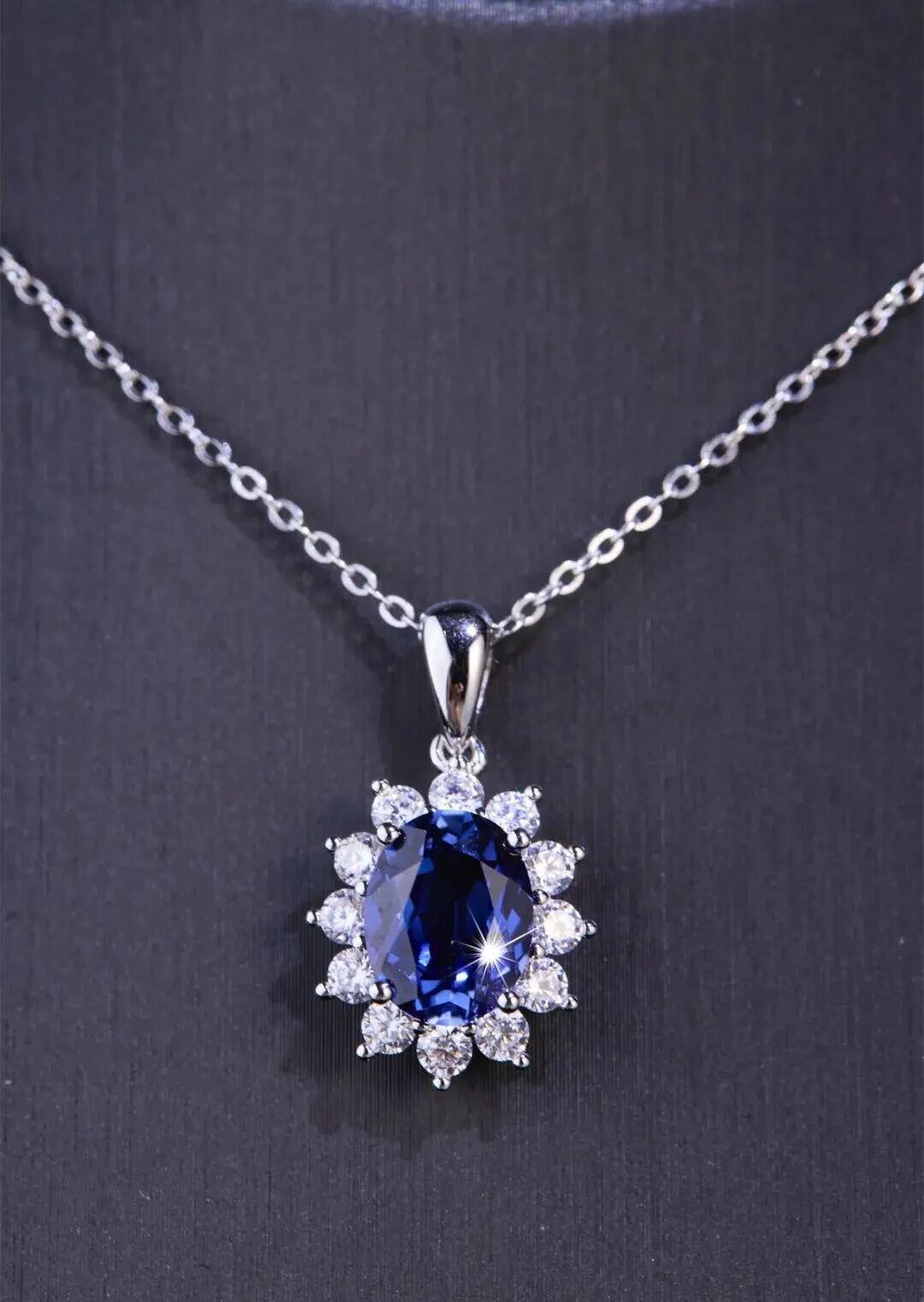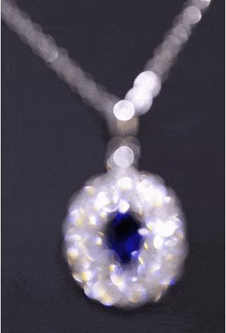 這款項鍊的中間是一枚2.6克拉重的【蛋形培育藍寶石】,周圍還鑲嵌了一圈璀璨鋯石,層層承託,就像是一串串晶瑩的露珠,拱衛着中間的主石。