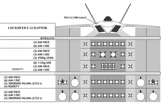 從武備選擇的角度上來說,F-22“猛禽”可以在制空任務時,機內彈艙裏攜帶6枚AIM-120C“阿姆拉姆”中程空空導彈與側彈艙中掛載2枚AIM-9L“響尾蛇”短程空空導彈。