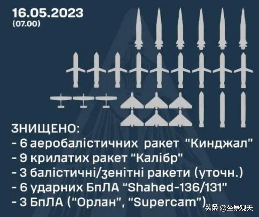 烏克蘭軍方在其當日的戰果中,稱其一口氣攔截了6枚Kh-47“匕首”高超音速導彈、9枚3M54“口徑”巡航導彈,另有12架自殺無人機(見證者-136與見證者-131)和偵查無人機(奧爾蘭-10)。