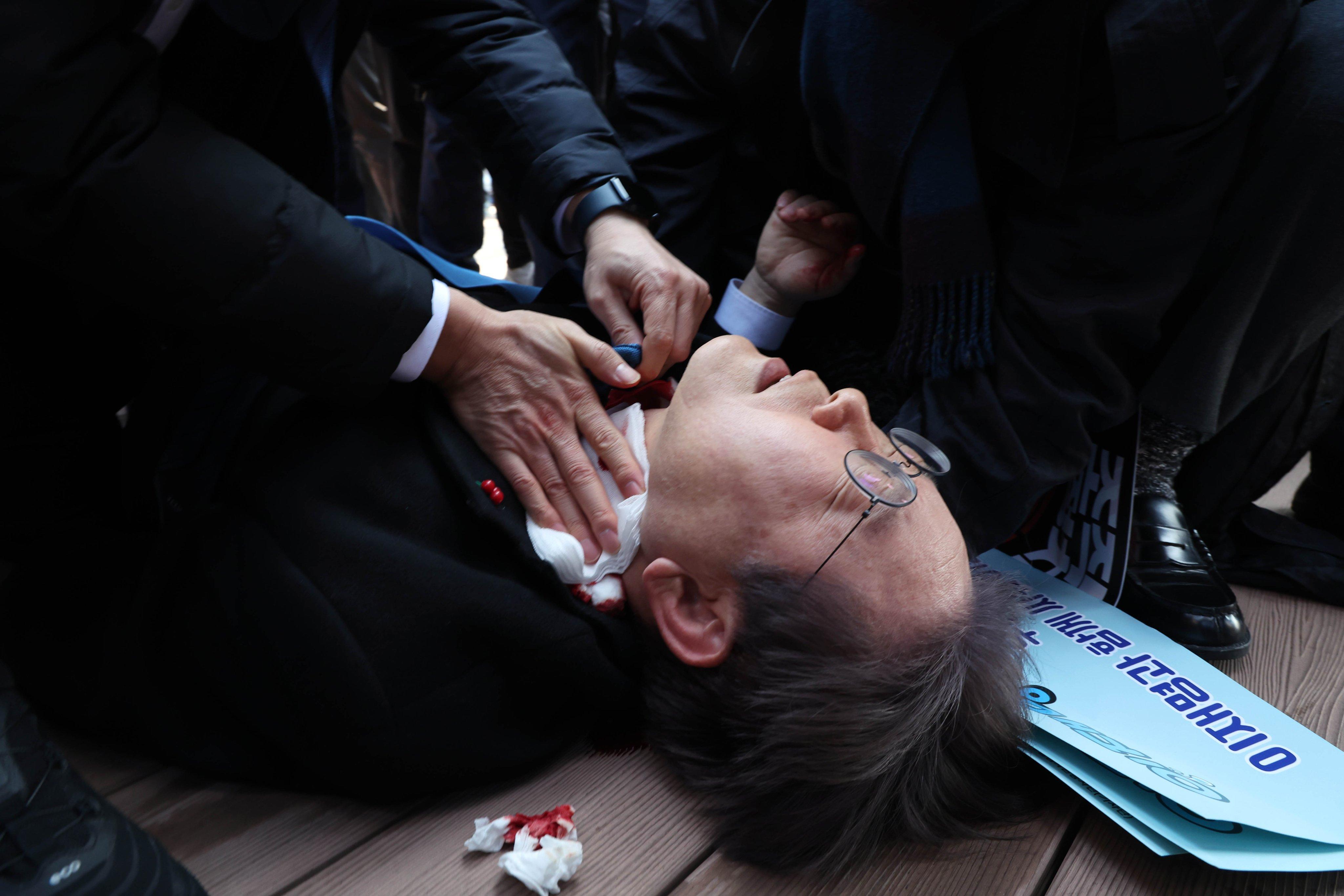 韓國也不甘示弱,最大在野黨黨魁李在明,在出席活動的時候,遭到襲擊,長達30釐米的刀,對他造成1釐米的傷,傷口長度不重要,重要的是位置,兇手直衝咽喉位置,明顯是沒想讓對方活啊。