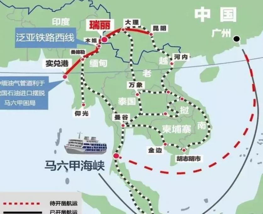 緬甸部分還沒建設,但是路線與它平行的油氣管道已經運營好幾年了,每年能向國內輸送120億立方米的天然氣,2000萬噸的石油。緬甸也不是白幫我們的忙,他們會收點過路費,但是我們也覺得,這個買賣挺划算,因爲馬六甲海峽旁邊有美軍基地,平時沒啥事,萬一呢,是吧,咱們還有備選方案。