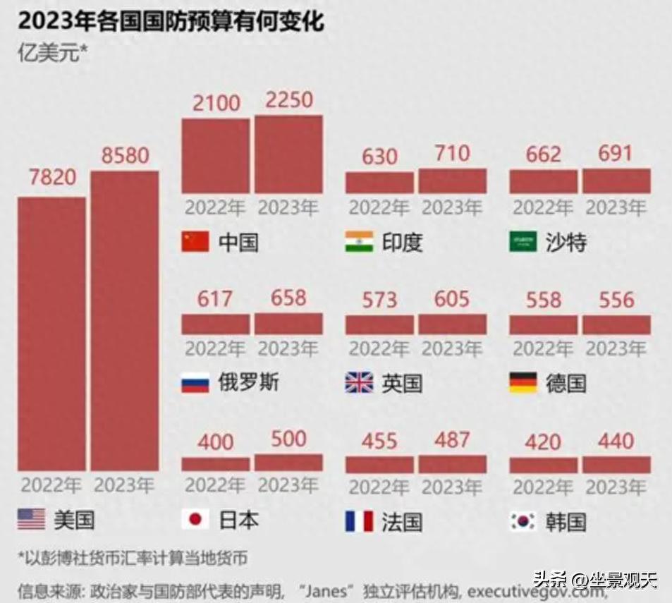 據美媒彭博社報道,在2023年度各國國防預算排名中,中國以2250億美元穩居全球第二的位置,但與美國8580億美元的國防預算相比,僅僅是美國軍費的26%。