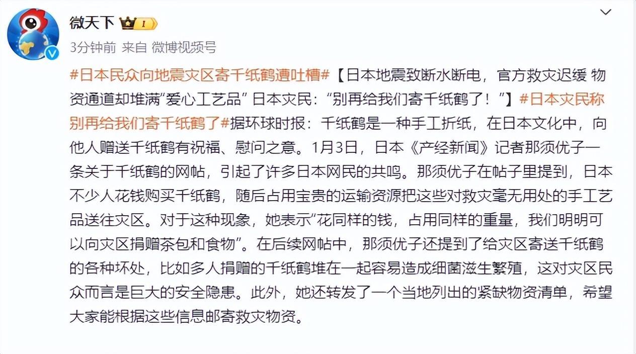 積石山地震後,中國民衆有錢的捐錢,有力的出力。這回,日本民衆也是這樣,但是他們卻捐了一大堆千紙鶴,沒錯,就是用紙疊的千紙鶴,災民感動壞了,說:我們缺衣少食,連水都沒有,你們卻給我們捐這個?寶貴的運輸資源,你們卻用來運千紙鶴,八格牙路!