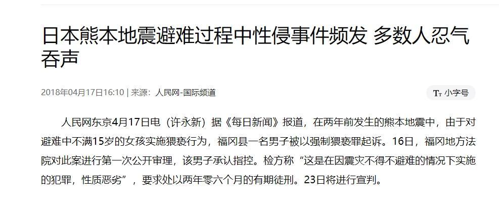 2016年日本地震後,熊本縣警察收到了約10起性侵、猥褻案件,搞得現在每次地震,官方都是發佈避難所防性侵指南。其他國家地震,你哪聽說過還有這個宣傳啊。