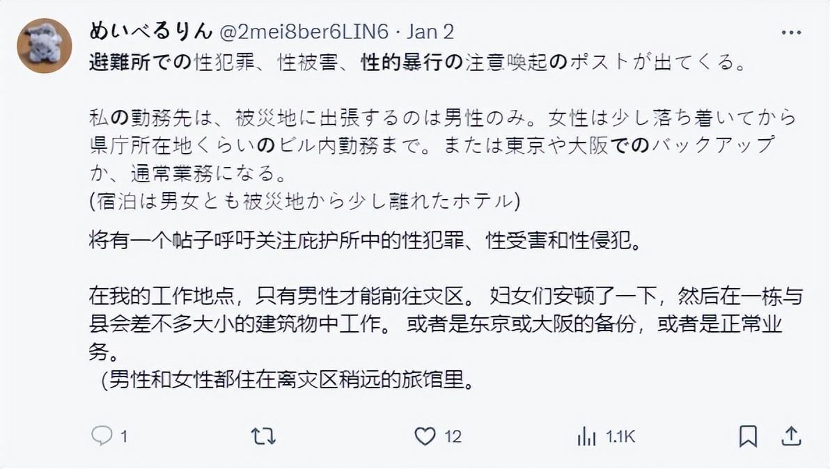 這次地震之後,日本明顯有經驗多了,網友都在提醒女性災民,別管是白天出行,還是晚上睡覺,甚至半夜上廁所,一定不要落單,一定一定要跟家人住在一起。還有一個日本網紅,給災民捐的既不是食物,也不是千紙鶴,而是性用品,說是要降低災區的性犯罪率。