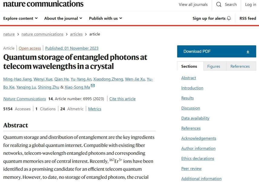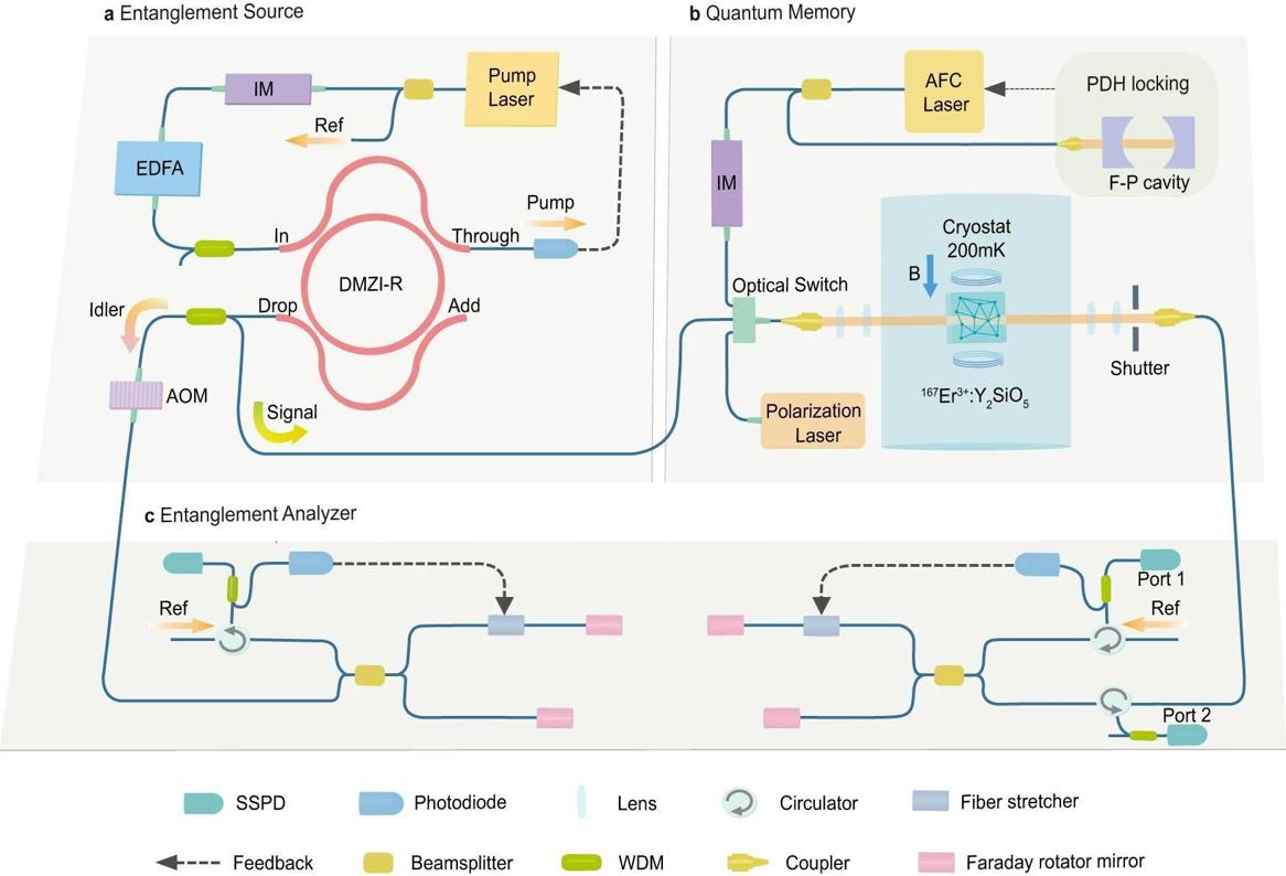 中國南京大學物理學院的研究人員,利用摻雜鉺離子50ppm的正硅酸釔晶體(Y2SiO5)製作了量子存儲器,並結合集成芯片上的新型糾纏光子源進行試驗,結果表明,即使在將光子存儲1936納秒,也就是約2微秒後,晶體中的糾纏態仍然得以保留,達到了以前工作的387倍,爲實用的大規模量子網絡鋪平了道路。