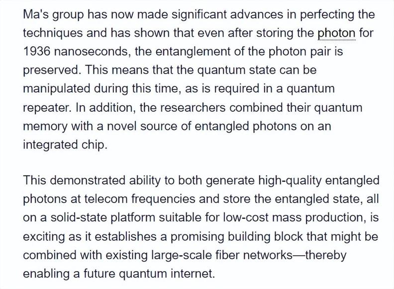 所以這絕對是一個重大的進步,根據物理學家網(PHYS)的說法,這種既能在電信頻率下產生高質量糾纏光子,又能在適合低成本批量生產的固態平臺上存儲糾纏態的能力令人振奮,是邁向實用設備的決定性一步。因爲它建立了一個很有前景的構件,可以與現有的大規模光纖網絡相結合,從而最終實現未來的量子互聯網。