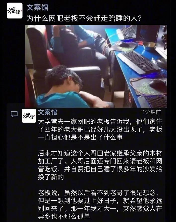 老闆一直擔心他是不是出了什麼事後來才知道這個大哥回老家繼承父親的木材加工廠了。大哥後面還專門回來請老闆和網管喫飯,並自費把自己睡了很多年的沙發給換了新的老闆說雖然很難見到這位老朋友了,但一想到他要過上好日子,就希望他永遠別回來了。紅塵之中,多是性情中人!爲什麼在網吧睡覺的人不會被趕?