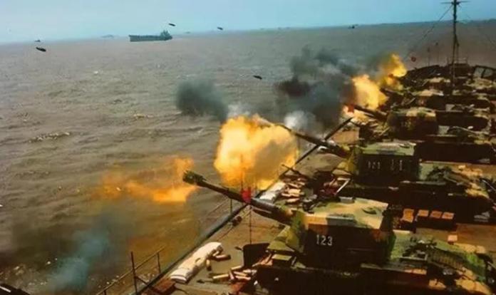 在這場演習當中,由於解放軍海上力量的匱乏,我們徵用了上千艘漁船,爲了彌補火炮的不足,還將坦克陸基火炮搬上了軍艦。