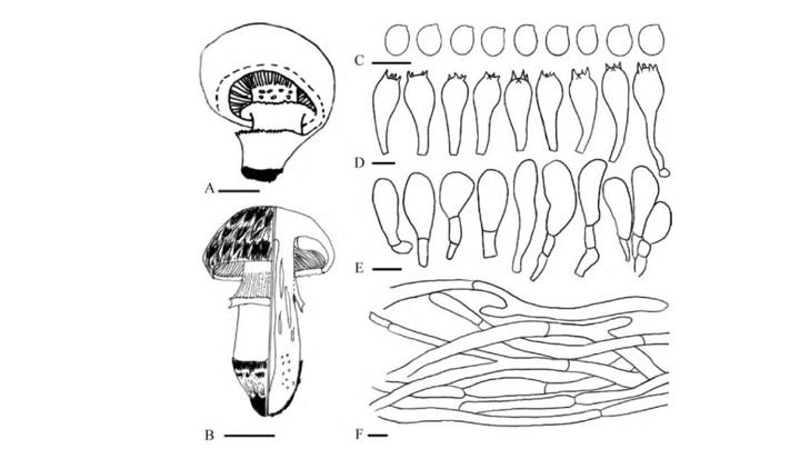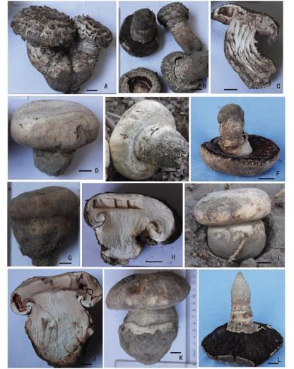 A–C. 新種德賈丁蘑菇,D–H. 帕達納蘑菇,I–L. 新種中國美味蘑菇 (圖片來源:Edible species of Agaricus (Agaricaceae) from Xinjiang Province (Western China))
