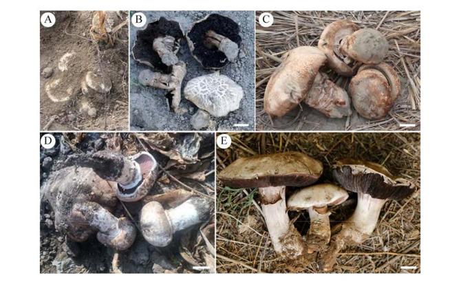 4種“葦菇”,你能分辨清嗎?A:埋在土裏生長的葦菇;B:大肥蘑菇;C:中華美味蘑菇;D:亞託柄蘑菇;E:帕達納蘑菇 (圖片來源:《野生食用菌“葦菇”的物種多樣性及中華美味蘑菇適生區預測》)