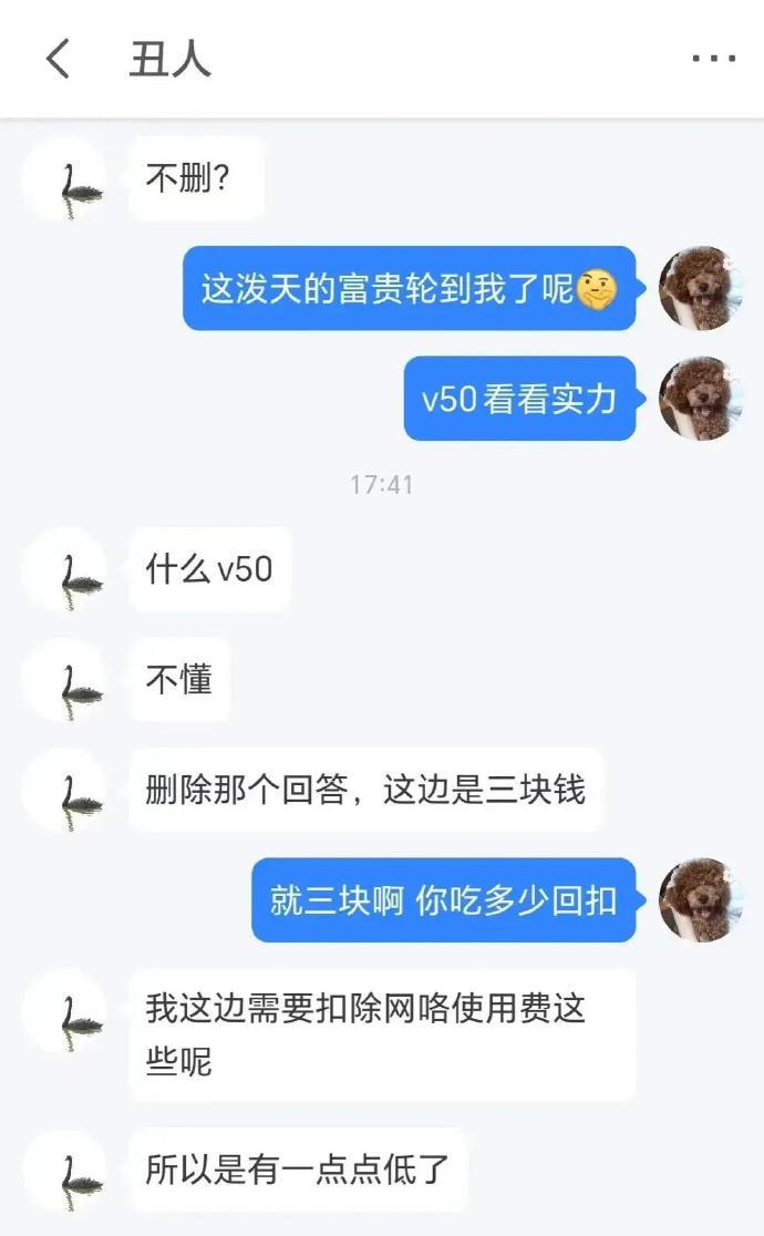 然後博主就和他繼續聊,聊完才發現,這個二道販子是真黑啊,人家原本給200多,層層轉包之後,只給人家3塊錢,就想讓人家刪帖。