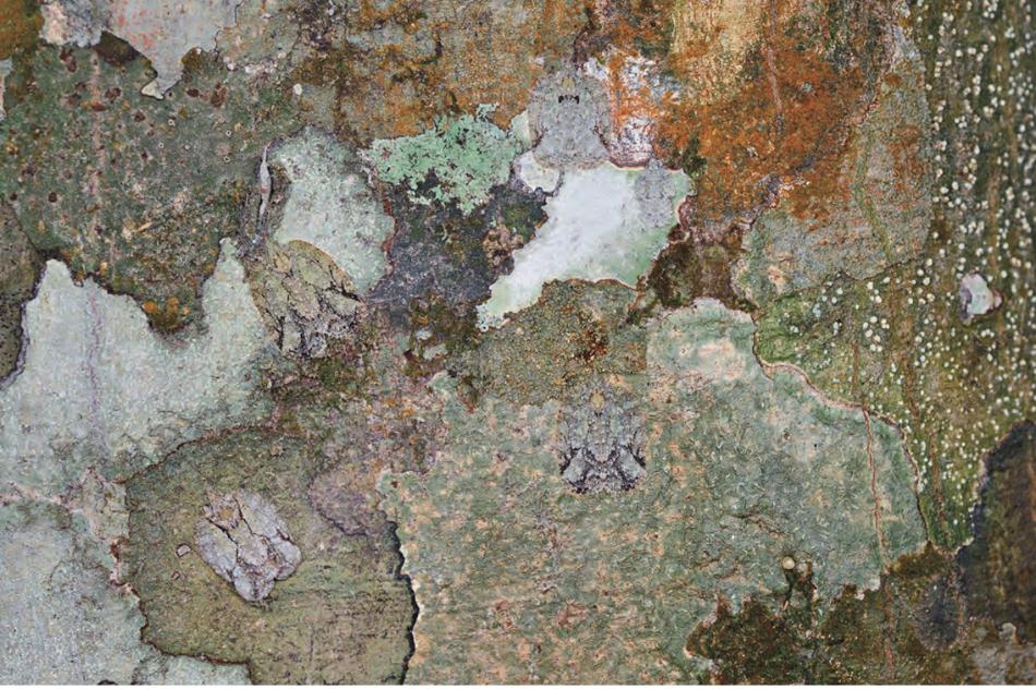 蛾蠟蟬緊貼着樹皮,爲了更好地模擬色彩斑駁的地衣,它們翅膀上的色彩也不盡相同。圖中一共五隻蛾蠟蟬,你能找出來嗎?(圖片來源:Veer圖庫)