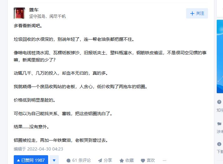 引得許多自由職業者躍躍欲試,恨不得明天就上手!要知道收破爛年入二十萬,可比送外賣三年102萬靠譜多了!可惜諮詢了相關從業人員!這比送外賣還難!當地沒有人脈你幹不起來,買入賣出的生意,屬於個體工商戶界別,不是大街上拖着一麻袋去垃圾桶翻,靠的是對鐵,鋁,銅等廢舊金屬回收市場的掌握,靠的是家裏有場地放,