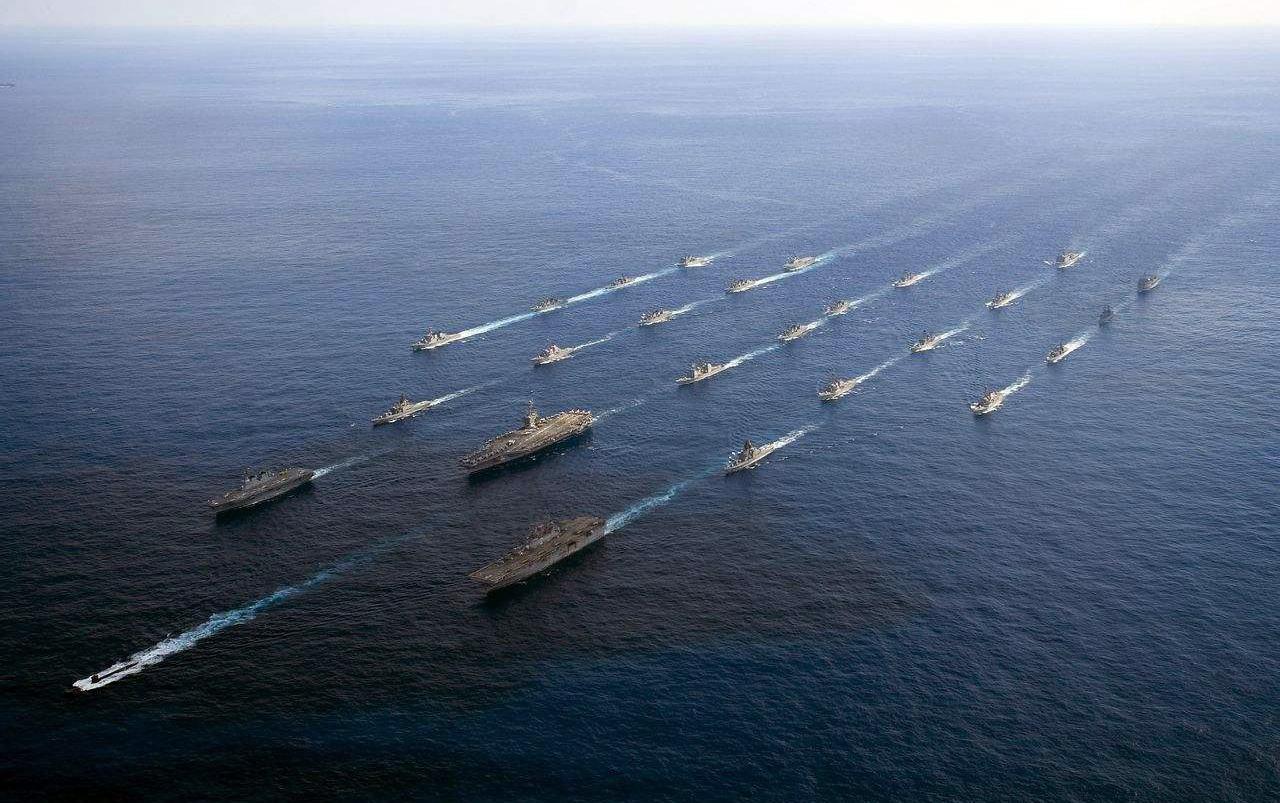 以美國的航母戰鬥羣爲例,編隊的構成和規模都是非常可觀,核心戰艦就是一艘航空母艦,一艘巡洋艦作爲先鋒開路艦船,加上左右翼兩艘導彈驅逐艦護衛。此外還能增加兩艘攻擊艦和核潛艇等不同型號的艦船多達十艘左右。